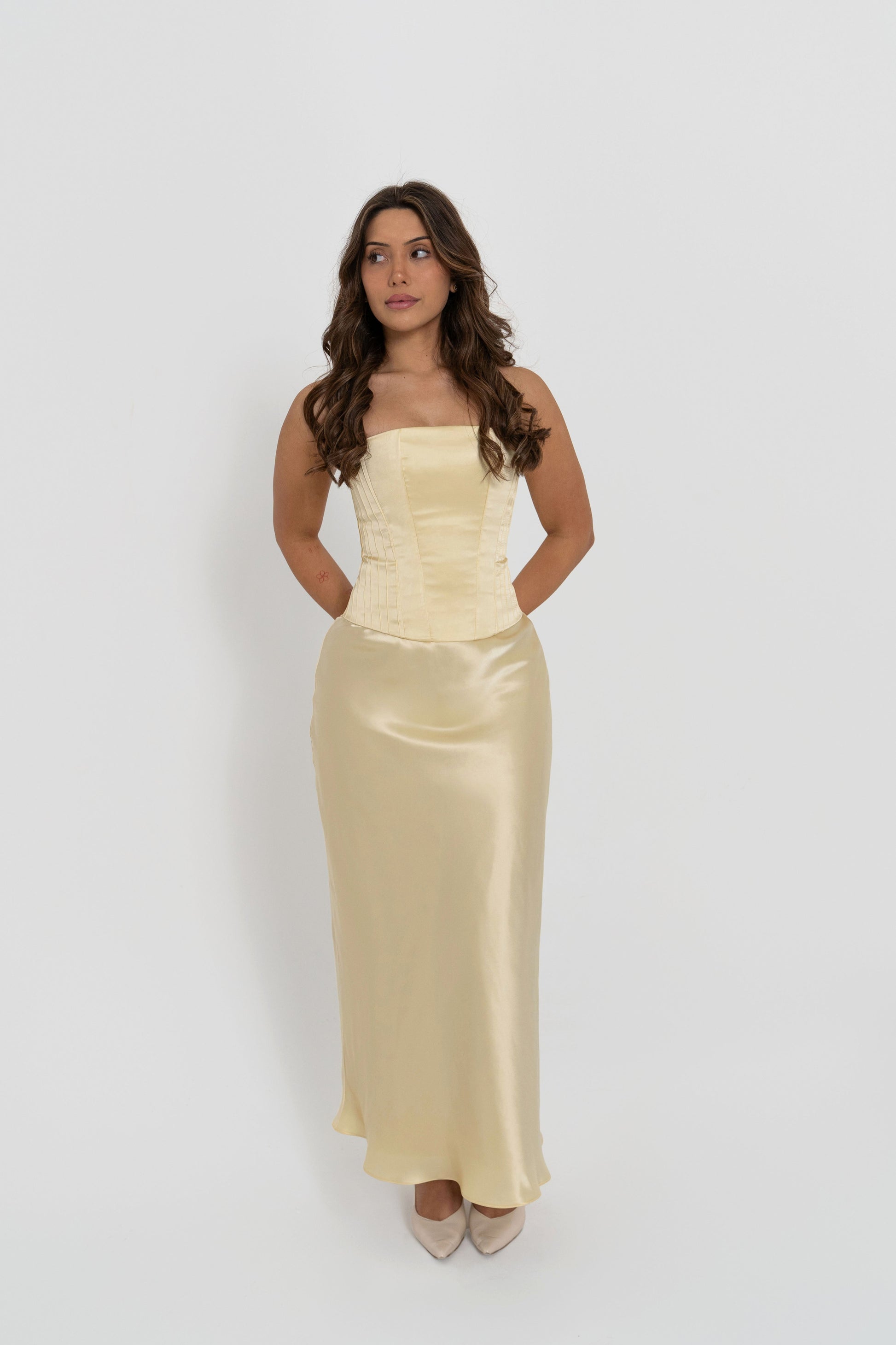 Bias cut for an elegant drape and effortless feel. Designed to fall beautifully without being too flared or fitted. Featuring an elastic waistband internally that is invisible on the outside, to mould to your waist. Can be worn lower on the hip depending on your preferred fit.
